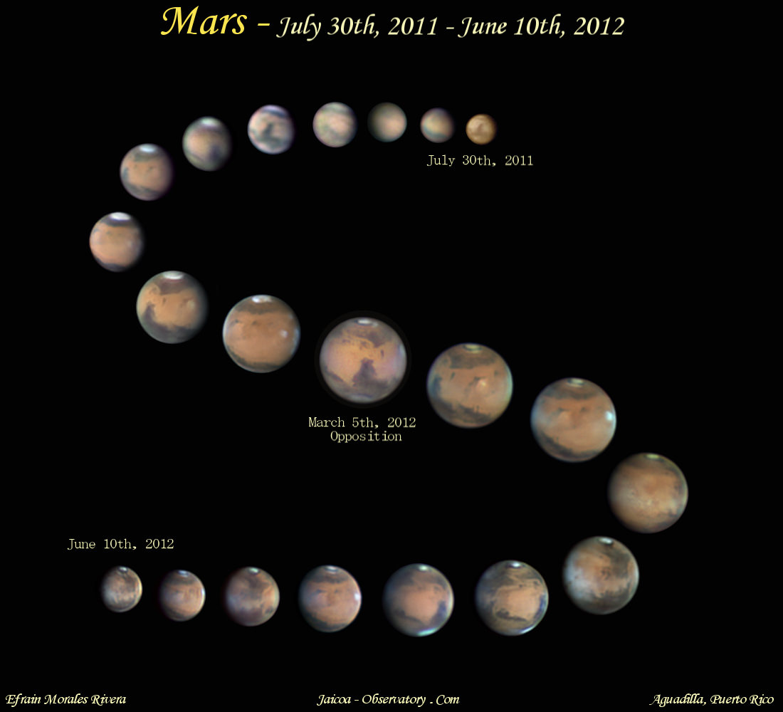 on this big "S" created by putting together views of Mars for one full year. Efrain Morales from the Jaicoa Observatory in Puerto Rico compiled just a few images of Mars he captured from July of 2011 to June of 2012, and this collage shows the size differences in how Mars appeared in a telescope as the planet moved toward and then reached opposition in March of 2012, and how it appeared during the months afterward. Also visible is how the North Polar Cap decreased in size as the seasons changed on the red Planet.