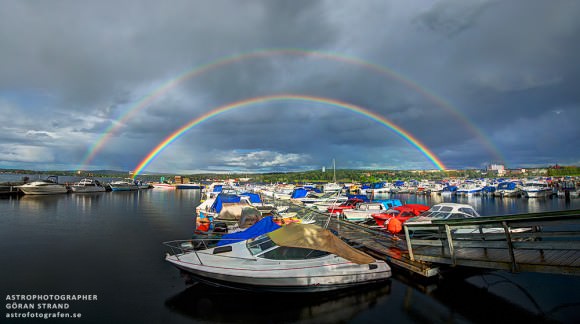 Double rainbow over a marina in Sweden on August 19, 2013. Credit and copyright: Göran Strand[/caption]