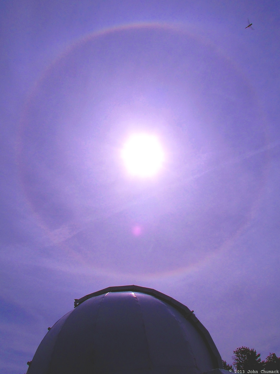 A beautiful atmospheric effect wasn't the only thing hovering above John Chumack's observatory dome this weekend. A dragonfly flits over John's observatory in Dayton, Ohio, joining a spectacular solar halo, a ring around the Sun created by ice crystals in Earth's atmosphere. John used a simple point & shoot Canon XS 160 camera to capture the scene.