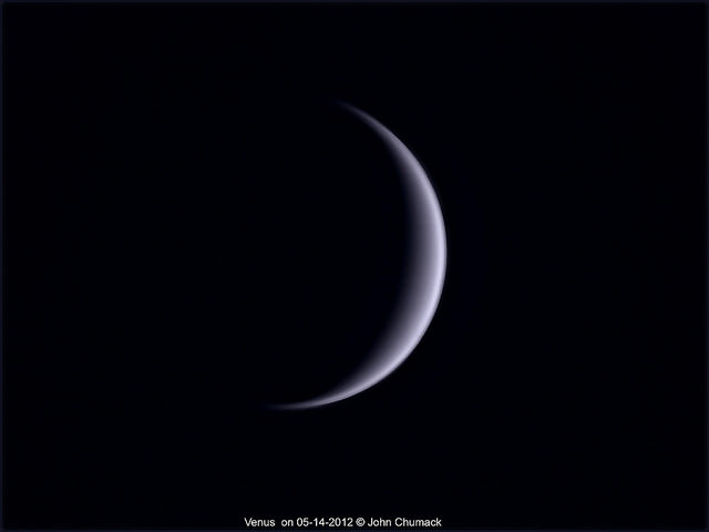 Named after the Roman goddess of love and beauty, Venus has never looked more gorgeous! Prolific and accomplished astrophotographer John Chumack captured this shot of a crescent Venus on May 14, 2012 as it moves in for a transit of the Sun. Just 14% of Venus' face was illuminated, 22 Days before the June 5th Transit of Venus across the Sun. John used a DMK 21AF04 fire-wire Camera, 2x Barlow, & 10" SCT telescope, and used 950 frames stacked to create this image. Thanks to John for sharing his image; see more of his work at his website,