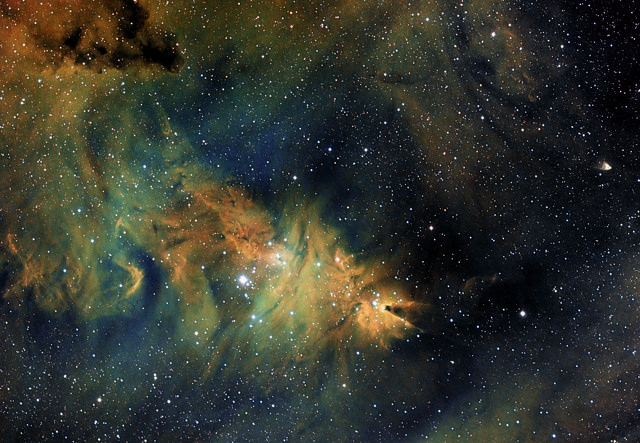 "This is an H II region located in the constellation Monoceros," César says, "a region with much stardust. The picture shows also the Hubble Variable Nebula, like a little flash at the top right. This is a vast field reached with the telescope and focal reducer FSQ106, which gives a focal length of 385mm with great resolution. The camera used was the FLI8300, with 4:30 hours of exposure."