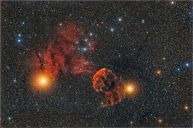 , here's an amazingly beautiful wide-field view of IC 443 (also known as the Jellyfish Nebula) a supernova remnant, as well as IC 444, a small reflection nebula, together in the constellation Gemini, surrounded by a sea of stars. Astrophotographer