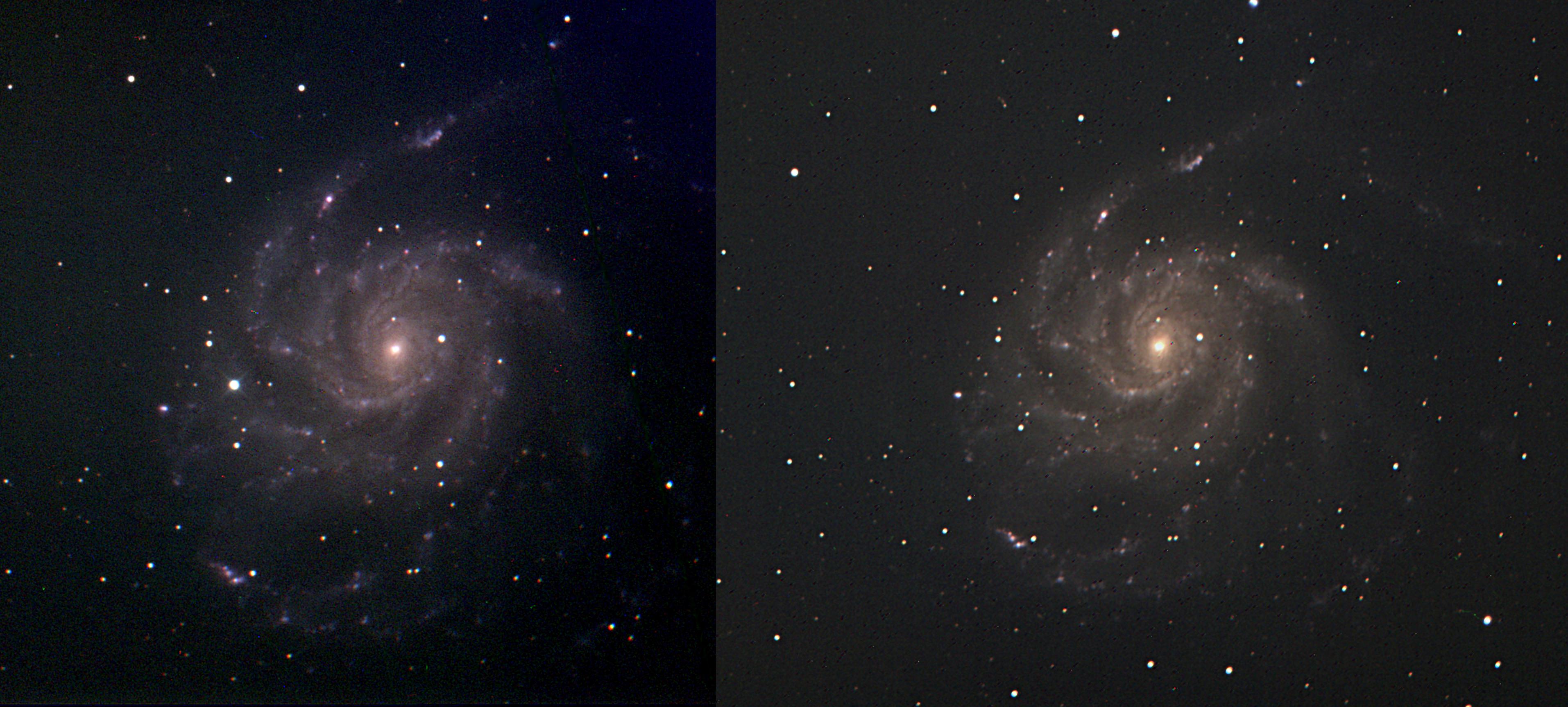It was literally an event of stellar proportions! In August 2011, a new Type Ia supernova was seen in spiral galaxy M101 a.k.a the Pinwheel Galaxy, located 25 million light-years away. Called PTF11kly, the bright supernova was a target for many astrophotographers. But what does it look like now? Here is a side-by-side comparison by Bill Schlosser from Ohio. It shows his image of the supernova on Sept. 26th, 2011 and then more recently, on June 9th, 2012. "The first was taken through my Astro Tech 10" RC (I have since sold it) and the second through my TEC 140mm APO," Bill wrote, and it clearly shows the supernova at its height (brightest object in the left picture, in the lower left side of the galaxy) to what it is today -- a small blue blob in the right-hand image. Bill is wondering if it is possibly a becoming nebula now?