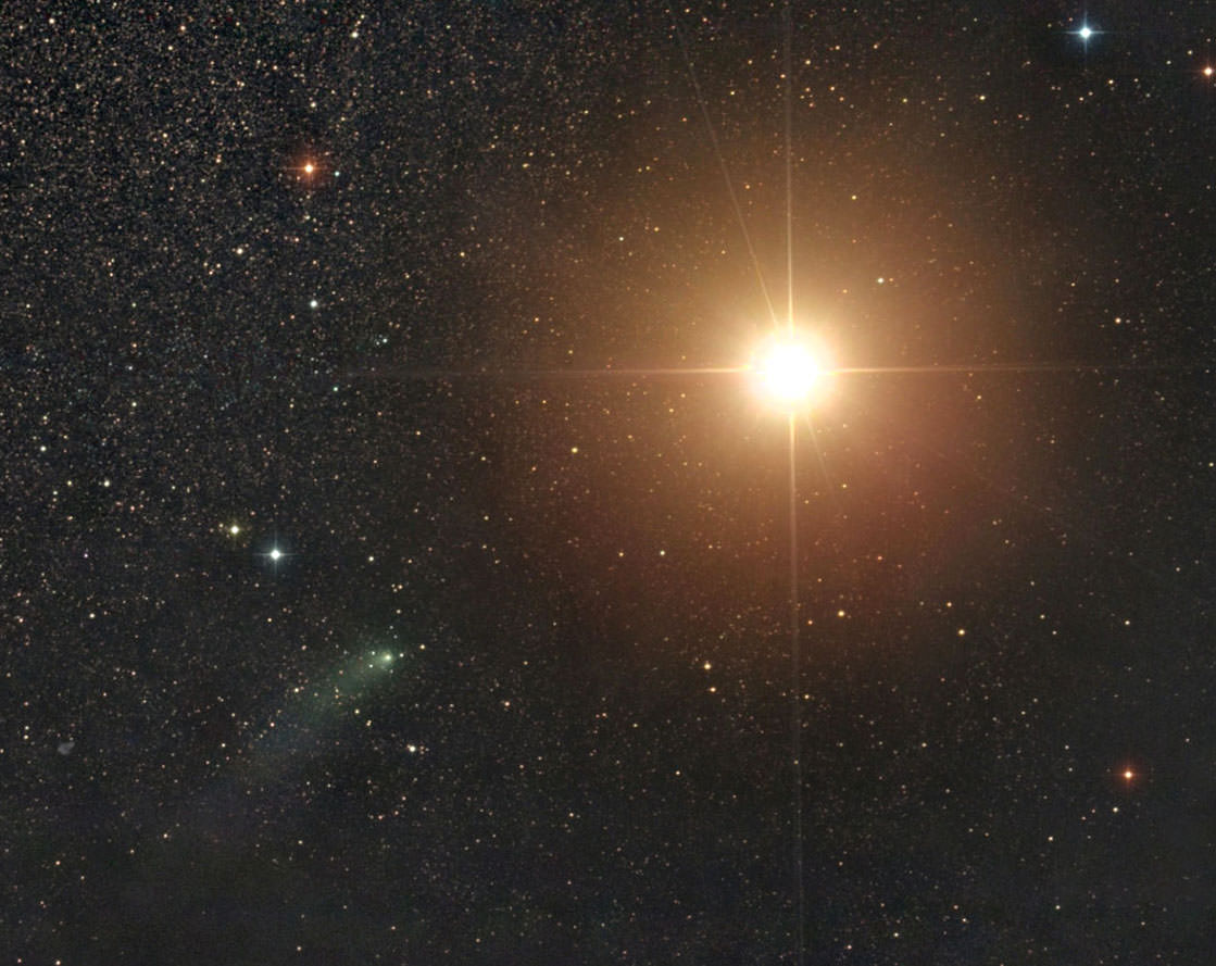approaching Mars taken just hours ago. The faint comet shows a small, condensed coma and bent tail against the glaring orange glow of the brilliant planet. Most photos of comets passing by a planet or deep sky object are lucky line-of-sight pairings with the comet in the foreground and object light years away in the background. Not this one. Both Siding Spring and Mars lie at nearly the identical distance from Earth of 151 million miles (243 million km).