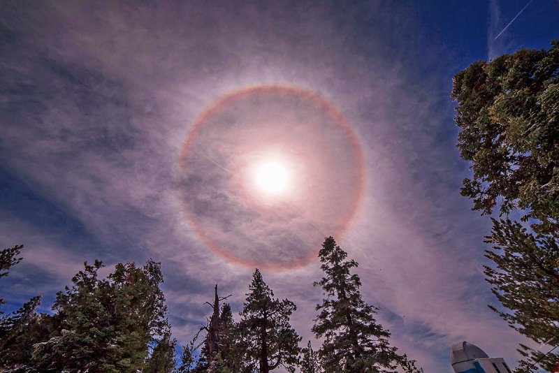 from the Chilidog Observatory in Monterrey, Mexico captured this stunning halo around the Sun on March 2, 2014. A solar halo is an optical phenomenon produced by ice crystals creating colored or white arcs and spots in the sky. Conditions in the atmosphere have to be just right, with moisture or ice crystals creating a "rainbow" effect around the Sun. Sometimes the halos surround the Sun completely, other times, they appear as arcs around the Sun creating what is known as sundogs. Basically, sunlight is reflecting off moisture in the atmosphere.