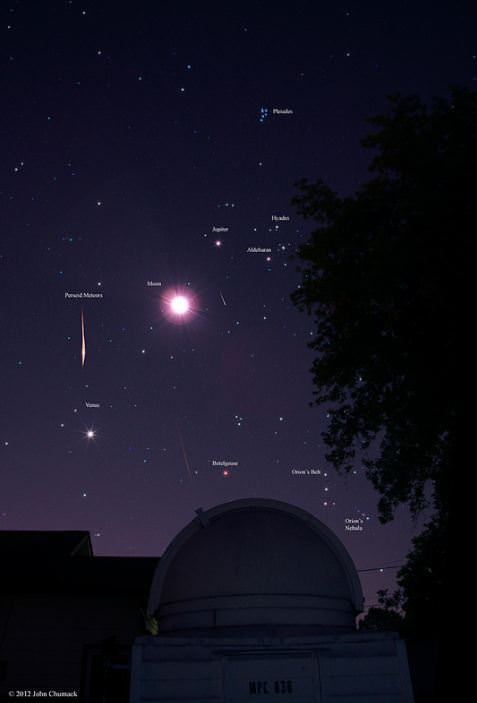 Caption: Perseid Meteors with Lunar & Planetary Conjunction on August 12, 2012. Credit: John Chumack.