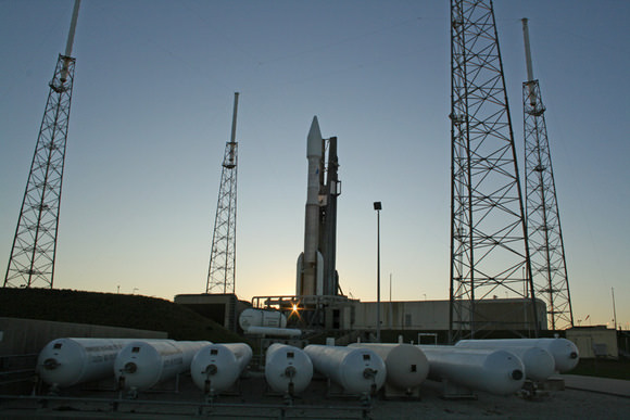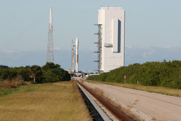 [caption id="attachment_45058" align="alignnone" width="580" caption="Atlas 5 rocket sits atop mobile launch platform at launch pad at Complex 41, Cape Canaveral, Florida on a cloudless day just a few hours prior to the scheduled post midnight launch on 14 November 2009. Note lightings masts at left and Vertical Integration Facility at right where rocket components are assembled. Credit: Ken Kremer"]