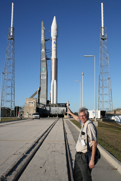 Just hours before the planned Atlas liftoff, I visited pad 41 on a special media tour for close-up photography and remote camera set up. The twilight sun was setting to the west behind the mighty bronze colored rocket topped by a white colored nose cone which protects the valuable satellite payload from aerodynamic forces as it pierces through the atmosphere. [caption id="attachment_45057" align="alignnone" width="387" caption="Ken Kremer with the Atlas launch vehicle at Pad 41 which will fly in the 431 configuration with 3 solid rocket boosters attached to the first stage and a single engine white colored Centaur upper stage. The Atlas 5 was rolled out to launch pad on Nov 12. Note tracks at center. The Intelsat satellite is encapsulated in a 4 meter wide extra extended payload fairing. A similar Centaur stage impacted the moon as part of the LCROSS mission."]