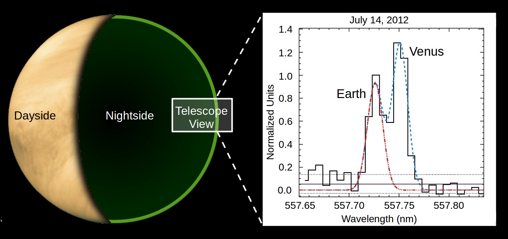 Nightglow has been a leading suspect for ashen light on the Venusian nightside, and a similar green line emission detection rivaling the 2012 event was made by Tom Slanger using the Keck I telescope 1999.