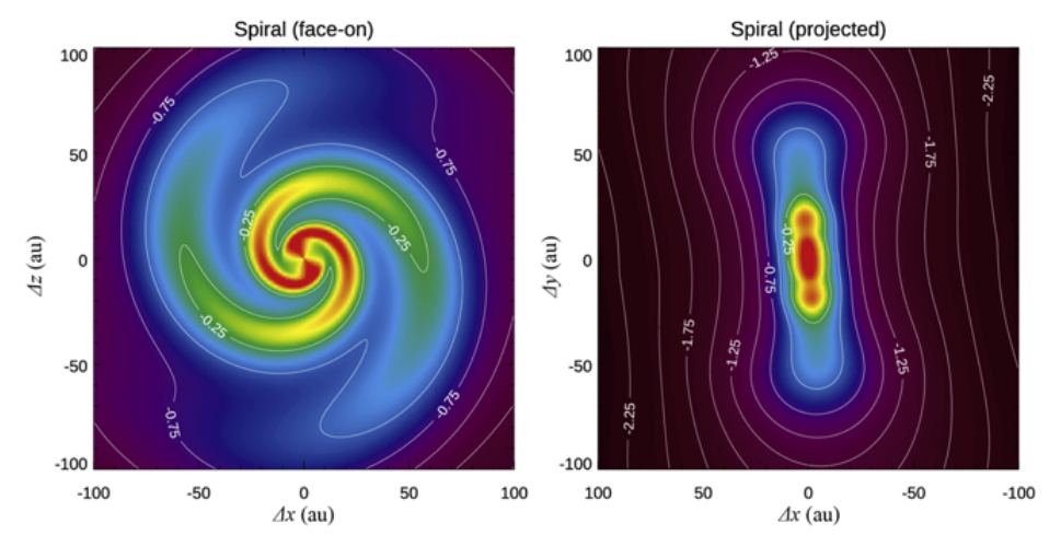 The researchers concluded that gravitational stability is creating the clumps. The gravitational instability could be caused by spiral arms or by fragmentation of the disk. Other studies have shown that spiral arms can cause instability that leads to clumps. "Spiral arms are commonly observed in gravitationally unstable disks," the authors write."We investigated whether spiral arms can be observed as clumps in an edge-on disk, similar to the VLA clumps in the L1527 disk."