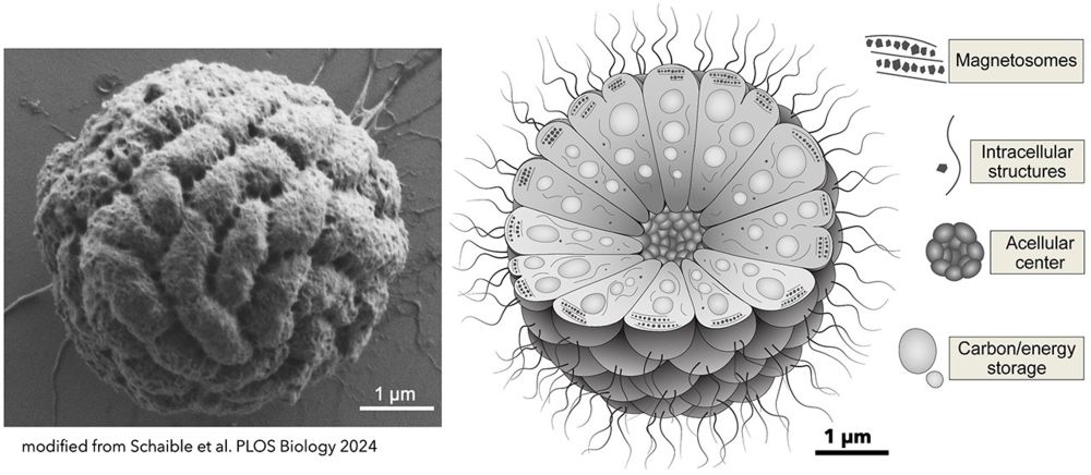 *This image and schematic show the detail in MMB. Individual cells are organized around an acellular center. Each cell contains a magnetosome, an intracellular organelle that holds iron inside a lipid membrane. The acellular center is material devoid of cells but still containing the extracellular matrix. Each cell has a compartment for energy and carbon storage. Intracellular structures in MMB are currently unidentified. Image Credit: George Schaible et al. PLOS Biology 2024*