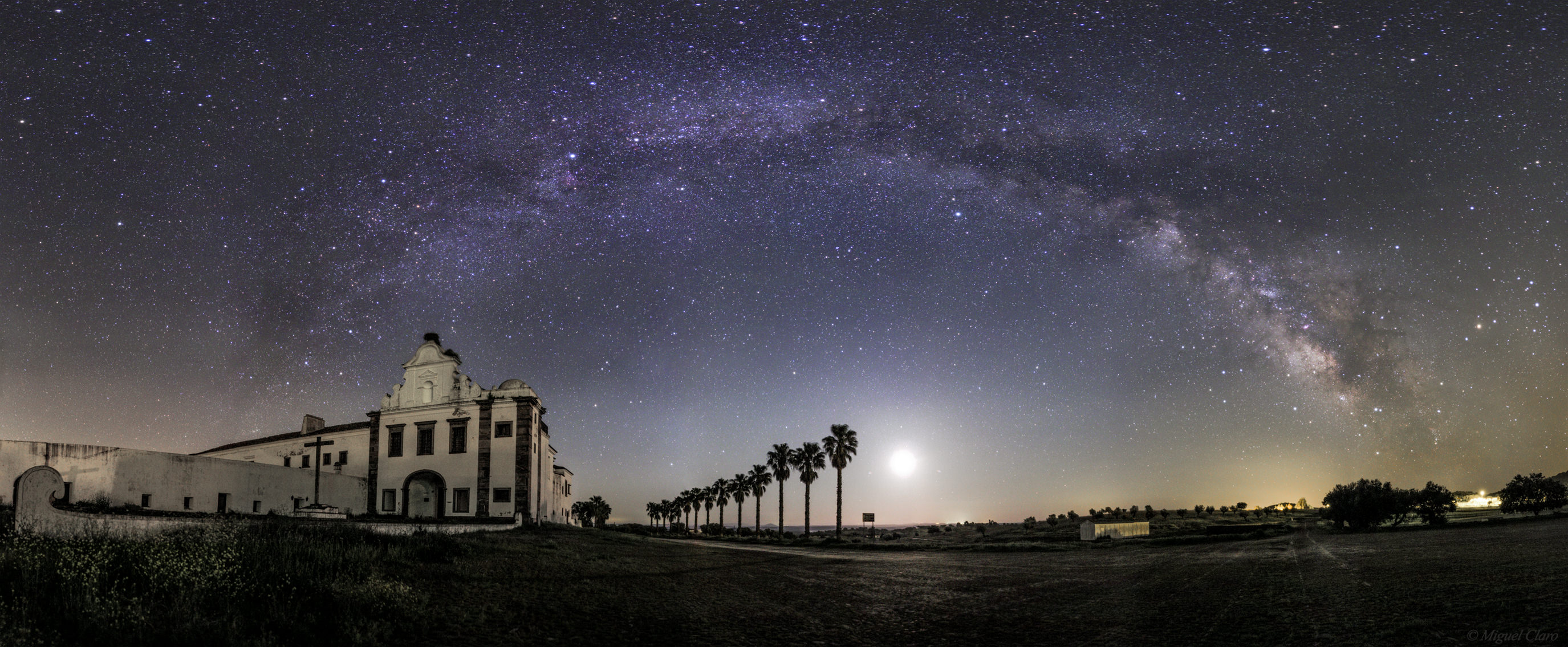 captured this stunning 21-image mosaic showing the arch of the Milky Way framing the setting Moon from Monsaraz, Portugal in the Alqueva Dark Sky Reserve. In the foreground is the Convent of Orada (dated 1670).