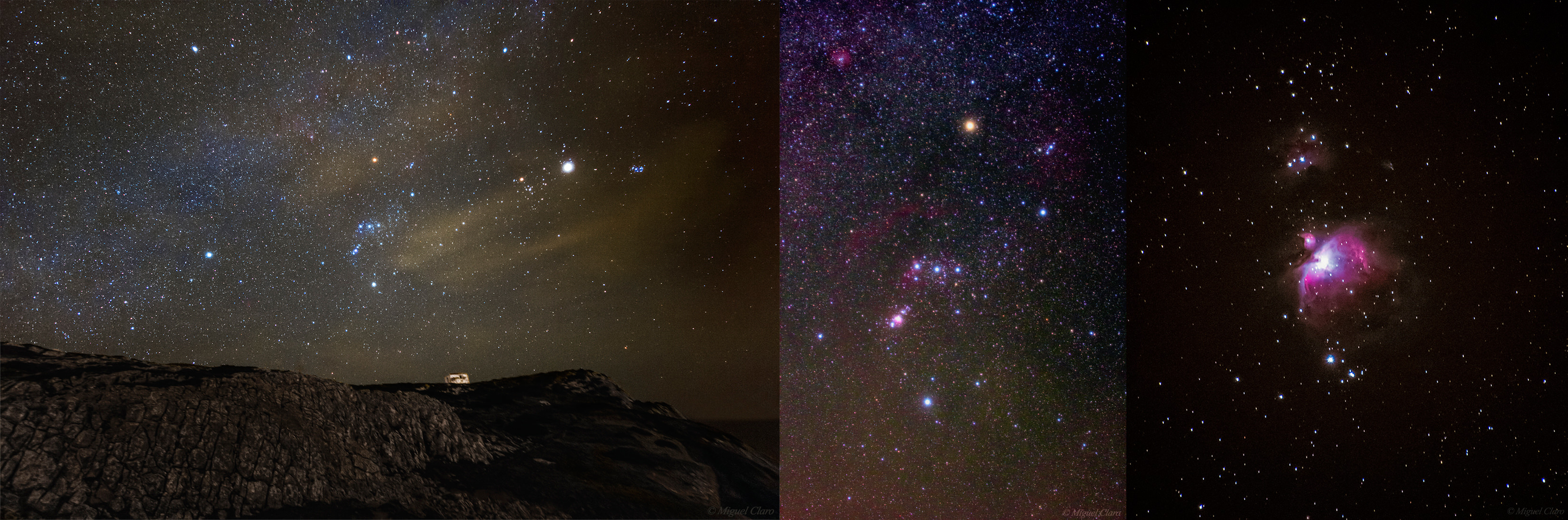. These images were captured from Cape Espichel, Sesimbra, Portugal, about 40 km away from Lisbon. This triple sequence poster contains a beautiful widefield view of the well-known winter constellations visible from the northern hemisphere; then a zoom in to focus on Orion; then Claro zooms in even more to find the Great Orion Nebula M42 and M43.