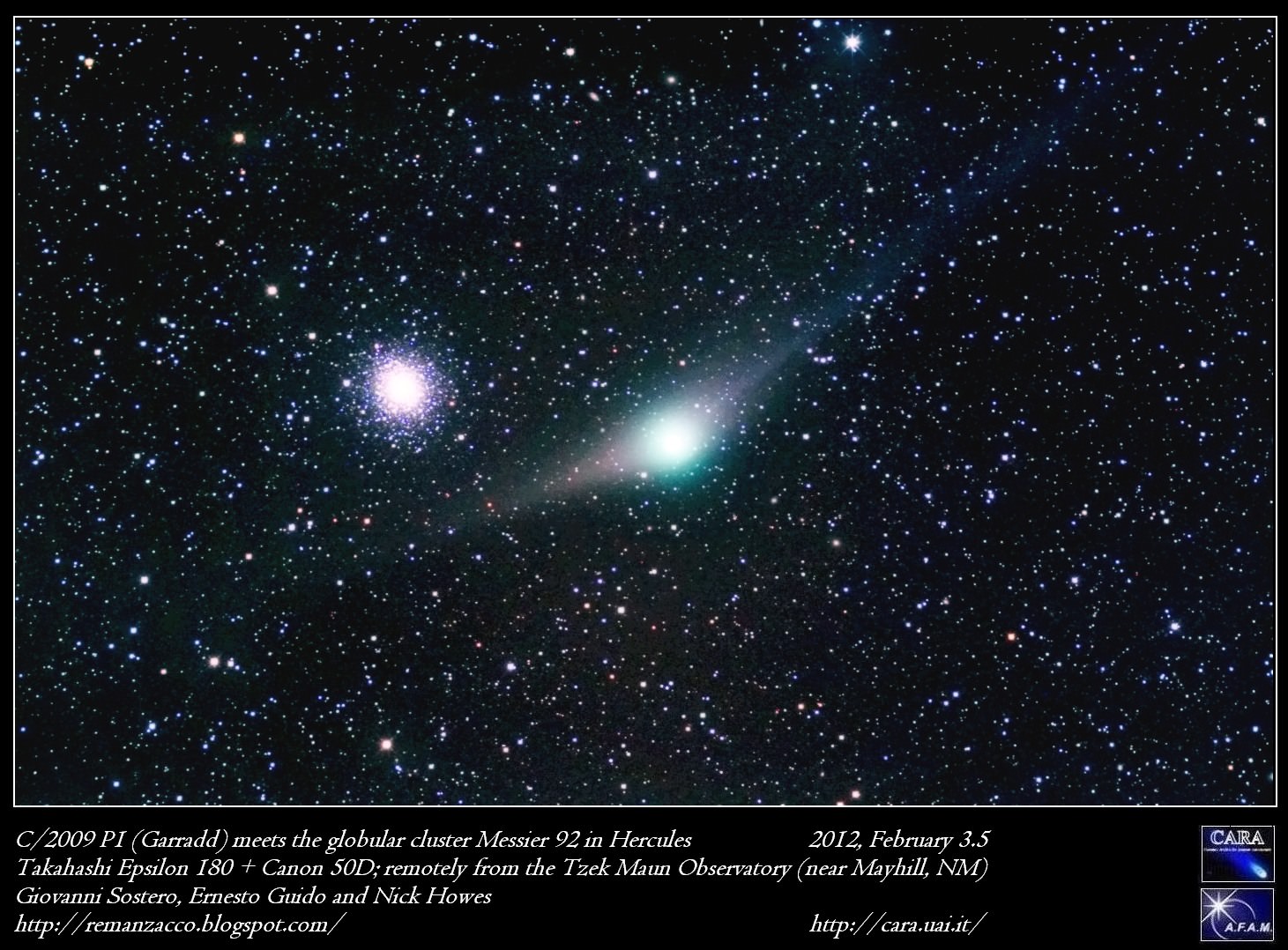 This lovely image of Comet Garradd (C/2009 PI) as it passes by the globular cluster M92 in the constellation Hercules, was taken remotely from the Tzek Maun Observatory in New Mexico by our friends
