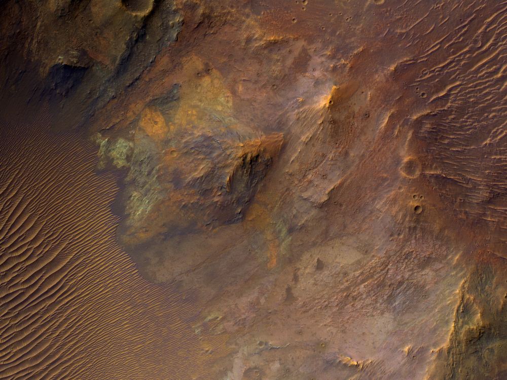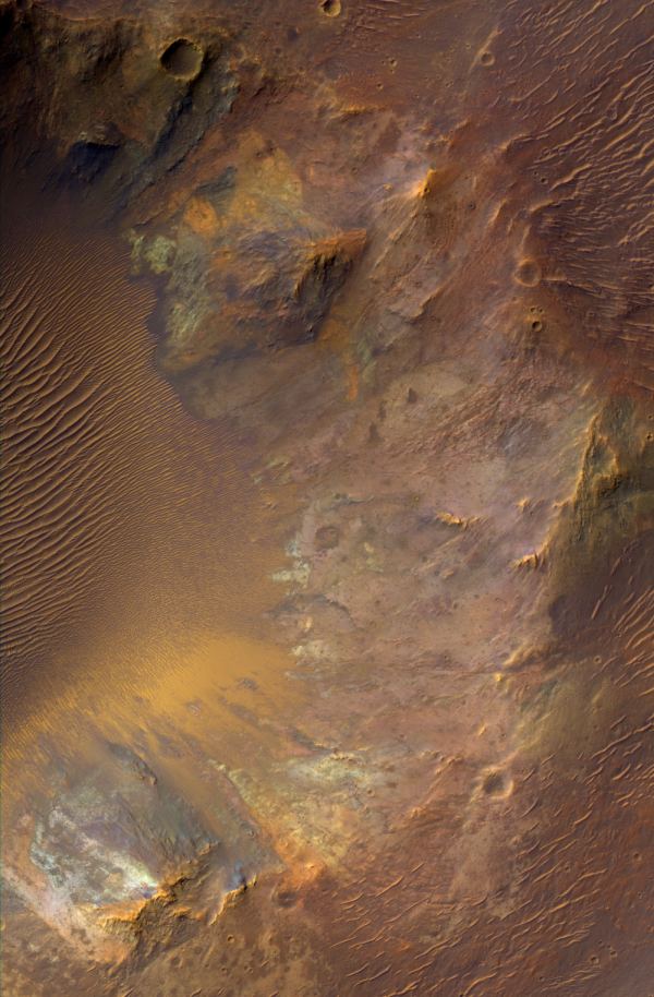 In this crater the central pit exposes bedrock with different colors. Each different color is a different bedrock "unit" with a different composition. In this crater, the CRISM (Compact Reconnaissance Imaging Spectrometer for Mars) instrument on the MRO identified clay-rich minerals.