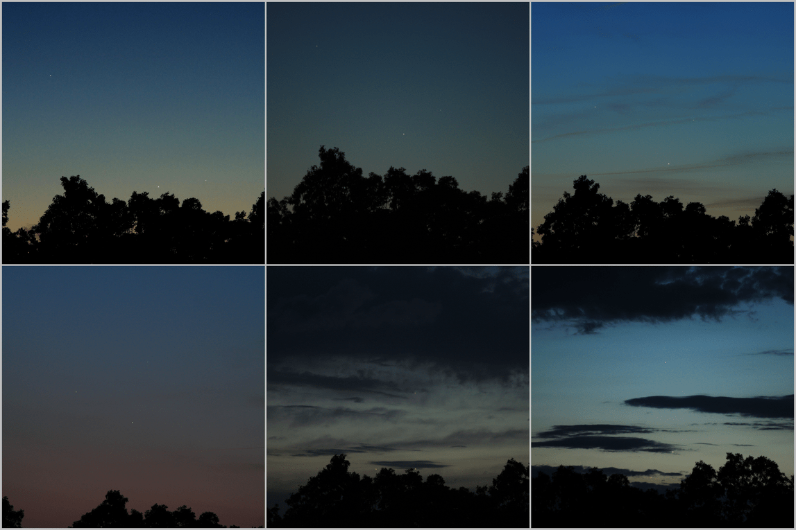 Joe Shuster from Salem, Missouri had six great evenings of photographing the planetary conjunction, and put them together into one collage. He used a Canon T1i and Nikkon 105mm lens. Lucky guy!