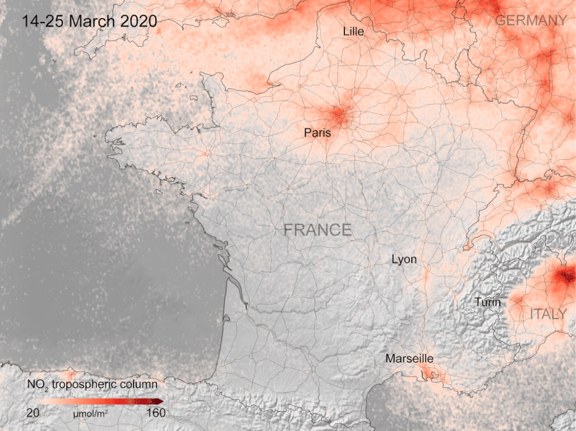 This data comes from the ESA, and their Copernicus Sentinel-5P satellite. It shows nitrogen dioxide (NO2) emissions over France in March 2019 in one frame, and between March 14th to the 25th on the next frame. Dense red indicates higher emissions of NO2.