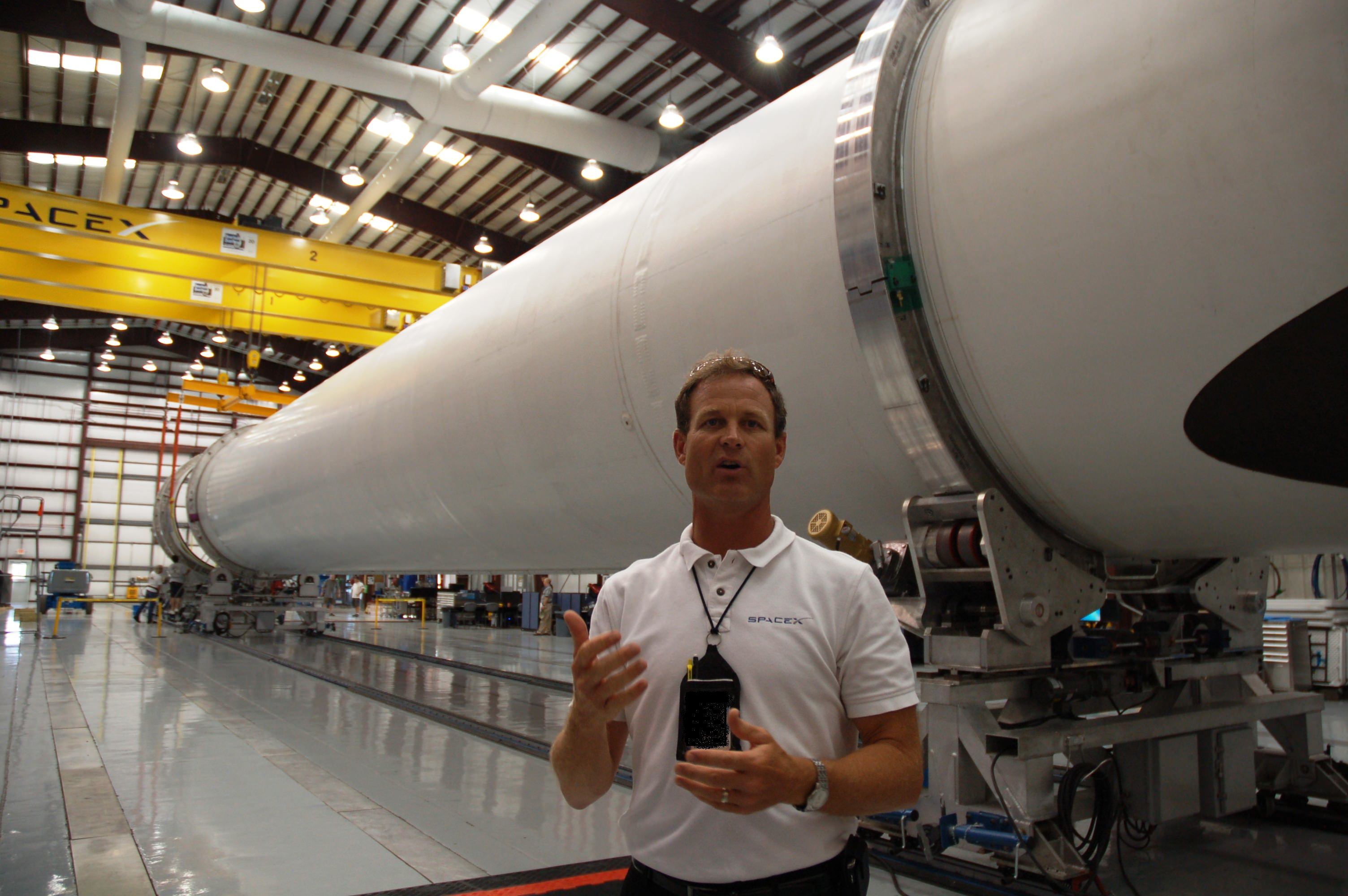 "Our concept of operations is unlike anybody else's that is flying these days with the exception of the Russians and maybe Sea Launch," said SpaceX's Director of Mission Assurance and Integration Scott Henderson. "We use horizontal integration, we will build an entire booster here in the hangar so you have the first stage and the interstage are here now, the second stage will arrive, the Dragon and trunk will arrive and we'll put all that together, test it inside the hangar and then when we are ready to roll out for launch we'll open this hangar door, you saw the vertical transporter-erector outside, that would lower down on pistons, we'd roll that whole structure…into the hangar drive the transporter-erector beneath the rocket, then roll out to the launch pad and lift it vertical."