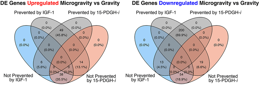 Geneticists use the terms down-regulation and up-regulation to describe negative and positive effects on gene expression. They found that 286 genes were down-regulated in microgravity. Of those, 200 showed a positive response to drug treatment and similar expression levels to cells in normal gravity.