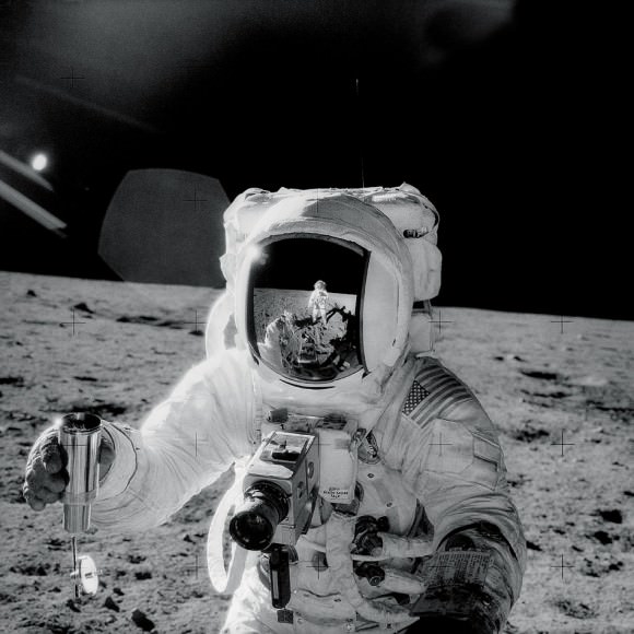 A teensy-tiny Neil Armstrong is visible in the helmet of Buzz Aldrin during the Apollo 11 landing in July 1969. Credit: NASA[/caption]