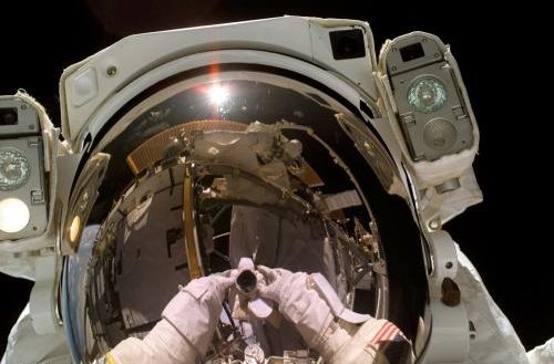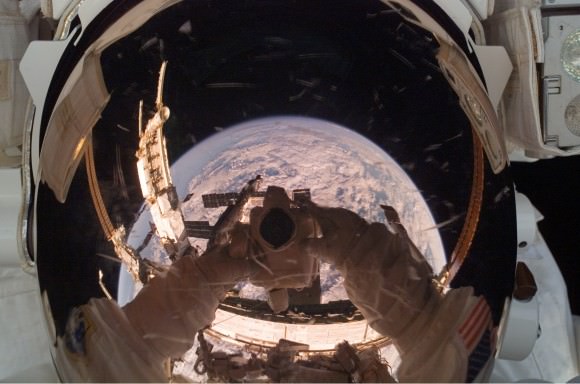 Mike Fossum, a mission specialist on STS-121, took this shot in July 2006. In the visor you can see space shuttle Discovery, part of the International Space Station and fellow crewmate Piers J. Sellers. Credit: NASA[/caption]