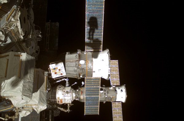 , when he was standing in restraints on the robotic Canadarm2. Off in the distance, he saw his shadow against the solar array panels of a Soyuz spacecraft.