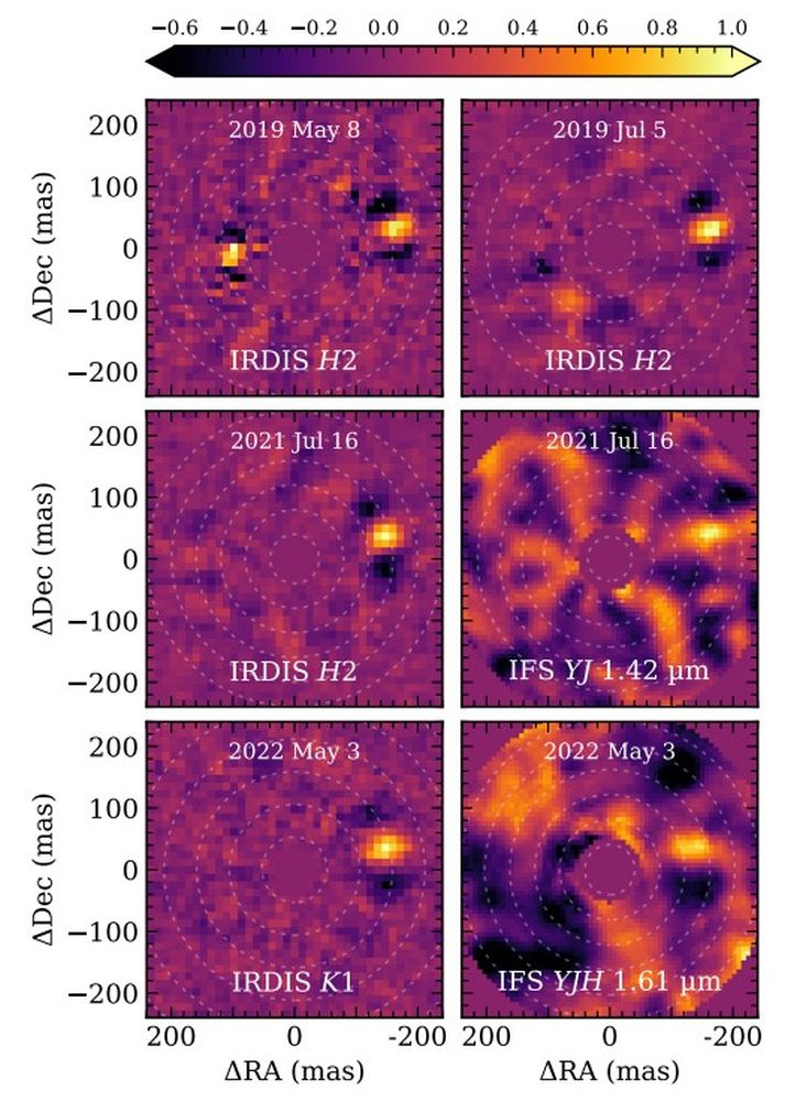 *This figure shows detections of HD 135344 Ab with the VLT and its SPHERE instrument. Four of the images are from it IRDIS (Infra-Red Dual Imaging and Spectrograph) instrument, and two are from its IFS (Integral Field Spectrograph) instrument. The planet is seen in westward direction (i.e., toward the right). The color scale is linear and normalized to the brightest pixel in each image. Image Credit: VLT/SPHERE; Stolker et al. 2025. A&A*