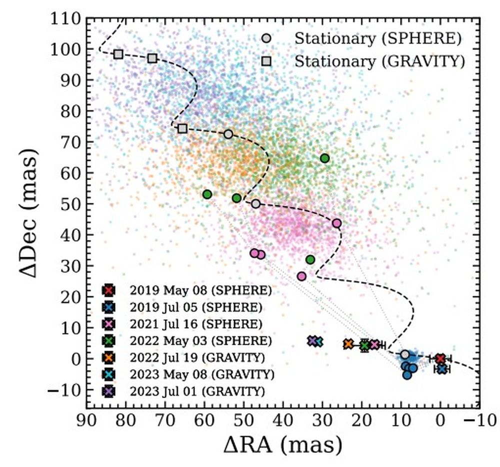 *This figure from the research shows how the astronomers determined that the new planet was not another star. It shows that the planet moves mostly eastward, whereas the background sources move northeast. The crosses show the positions of HD 135344 Ab, which moves eastward. The colored circles show the positions of the suspected background sources in the IRDIS field of view, which are connected with dotted lines between epochs. The dashed line shows the track for a stationary background source. Image Credit: Stolker et al. 2025. A&A*