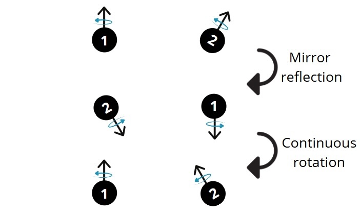 Where Noether's Theorem really shows its power is in particle physics. Although the mathematics of particle physics is complex, the underlying symmetries govern what can happen when particles collide. So, conservation of charge means that when a particle collision creates a shower of new particles, the total charge of all the particles must equal the total charge of the particles before the collision. Another basic symmetry is parity, also known as mirror symmetry. If you stand in front of a mirror and raise your right hand, your mirror image will raise its left. If you spin a ball toward your left, the mirror ball will spin to the right. Since elementary particles have an inherent rotation or spin, this means that particle showers should appear in rotational pairs.