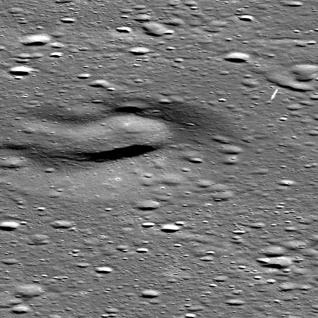 The Firefly Blue Ghost lunar lander set down on 2nd March 2025. The landing site (arrow) is about 4000 meters from the center of Mons Latreille, a large volcanic cone. NAC M1495577008LR [NASA/GSFC/Arizona State University].