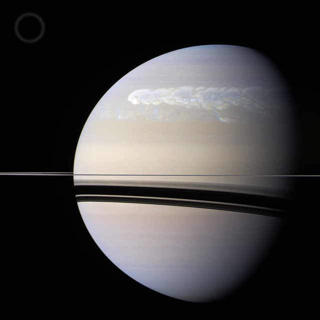The image above was created from Cassini raw images acquired in red, green, and blue color channels and assembled to create a somewhat "true-color" image of Saturn. The image shows the storm as it looked on February 25, 2011, a couple of months after it was