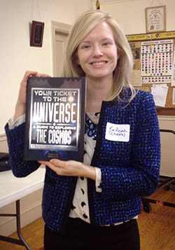 Author Kimberly K. Arcand holds a copy of her book during a presentation at the