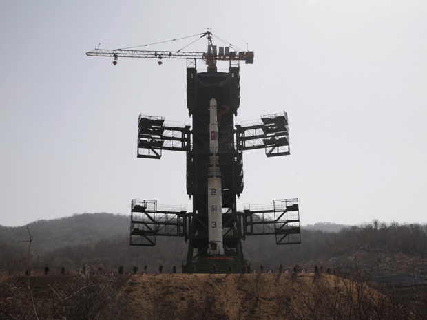 The 90 ton Unha-3 rocket is about 100 feet (30 m) tall.