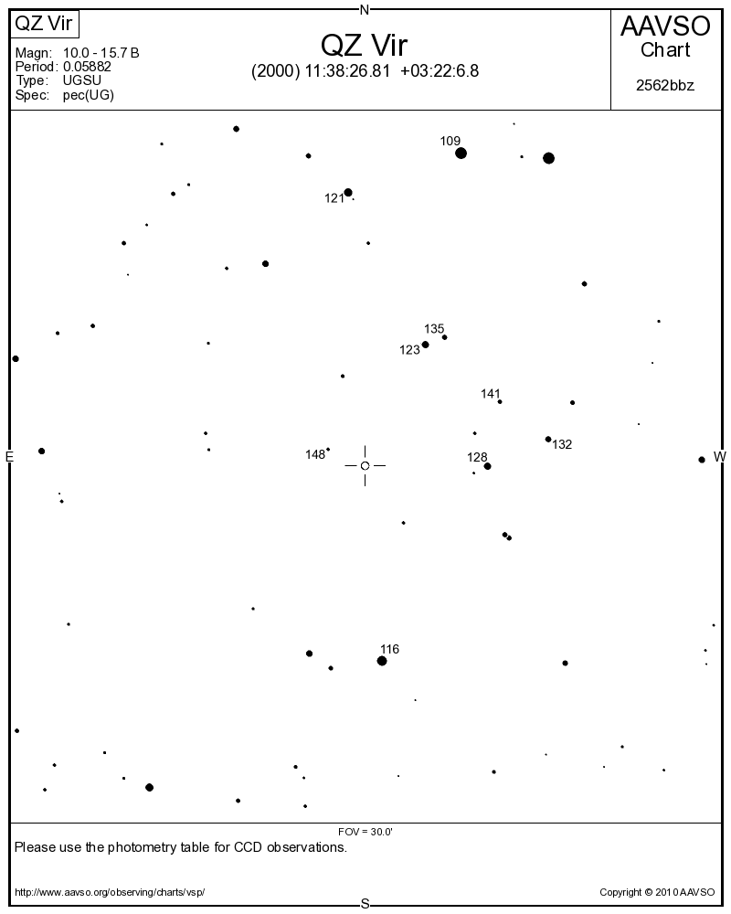 According to observations in the AAVSO International Database, the last regular outburst of QZ Vir, which is 16th magnitude at quiescence, occurred 4 July 2009 (JD 2455017, magnitude 10.6, Matsuyama), when it reached visual magnitude 10.3 and faded to 15th magnitude by 9 July (2455022). The last superoutburst (see AAVSO Special Notice #144) occurred between 19 January 2009 (JD 2454851, magnitude <14.0, Stubbings) and 21 January 2009 (JD 2454853, 10.97V, R. Diethelm, Rodersdorf, Switzerland), when it reached magnitude 10.0 and returned to 16th magnitude by 1 March 2009 (2454862).
