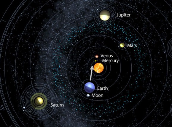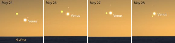 Positions of the planets on May 27. The arrow shows the point of view from Earth. Notice that the line of sight through all three takes our gaze near the sun. That's why they're only visible shortly after sunset in a bright sky. Click image to see a cool, interactive planet display. Credit: dd.dynamicdiagrams.com[/caption]