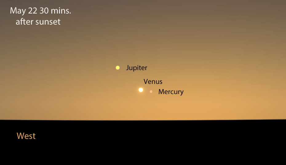 Three bright planets will highlight the northwestern sky this week and early next. Mercury is shown in pink and Jupiter in yellow. Time is 30 minutes after sunset facing northwest. They'll be closest together - less than 3 degrees apart - on the night of the 26th. Stellarium[/caption]