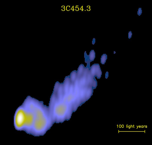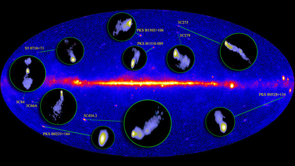 Now, astronomers from Germany, the United States and Spain have paired observations of the bright gamma-ray sky by NASA's orbiting Fermi Gamma-ray Space Telescope with those from the ground-based Very Long Baseline Array radio telescope in the United States to observe the material expelled with enormous speeds away from the black holes in the heart of very remote galaxies. These ejections take the form of narrow jets in radio telescope images, and appear to be producing the gamma-rays detected by Fermi.