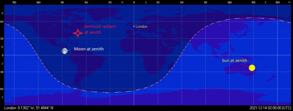 Circumstances for 2021: First, the bad news: the Geminids peak this year on Tuesday, December 14that 7:00 Universal Time (UT) or ~2:00 AM EST… just over four days prior to Full Moon on the 19th. This puts the Moon at 80% illumination waxing gibbous, meaning there's a narrow window of 'true darkness' between moonset and the beginning of dawn. For example, here in Norfolk, Virginia at latitude 37 degrees north, the Moon sets at 2:53 AM EST on the 14th, and dawn begins at 5:37 AM EST just a few hours later. This month's Full Moon is also the 'Long Nights Moon,' as the Moon rides high in the sky, just two days prior to the December 21stwinter southward solstice.