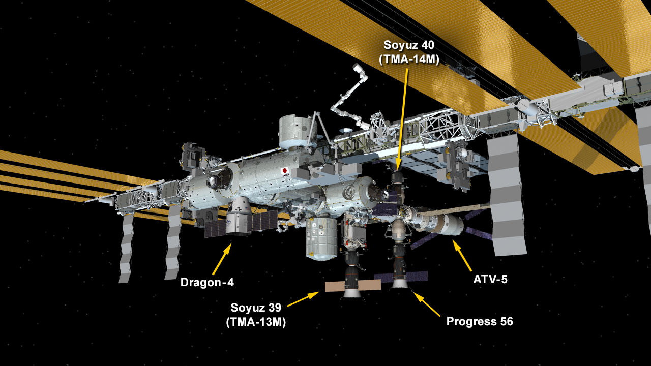 Also docked to the space station is the Soyuz ship that will take Suraev, Wiseman and Gerst home, a Progress resupply ship and the European ATV-5 supply ship.