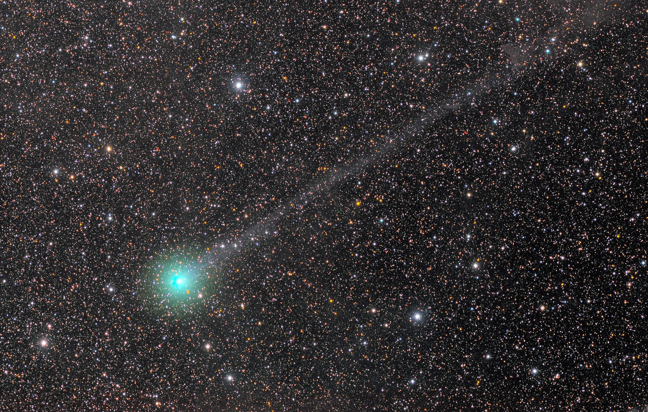 . He captured images of the faint, 15th magnitude wisp on August 17th with a Celestron C-8 fitted with a CCD camera at his roll-off roof observatory in Brisbane, Australia. Comet Lovejoy Q2 has a period of about 11,500 years with an orbit steeply inclined to the plane of the Solar System (80.3°), the reason for its sharp northern climb. As December gives way to January the comet crosses from below to above the plane of the planets.