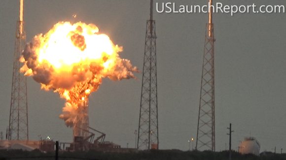 SpaceX Falcon 9 rocket moments after catastrophic explosion destroys the rocket and Amos-6 Israeli satellite payload at launch pad 40 at Cape Canaveral Air Force Station, FL, on Sept. 1, 2016. Credit: USLaunchReport[/caption]