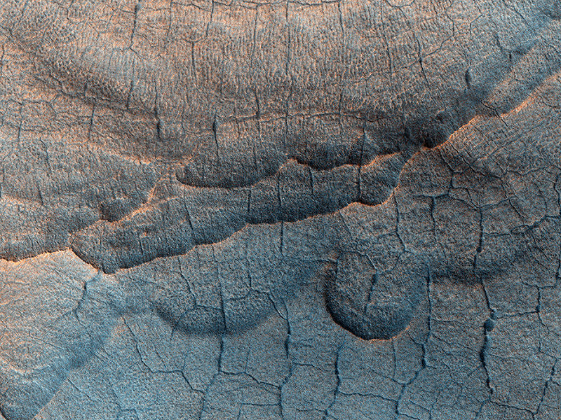 What is striking about the image are the polygon-shaped patterns of troughs and large scallop-shaped depressions. Mike Mellon,