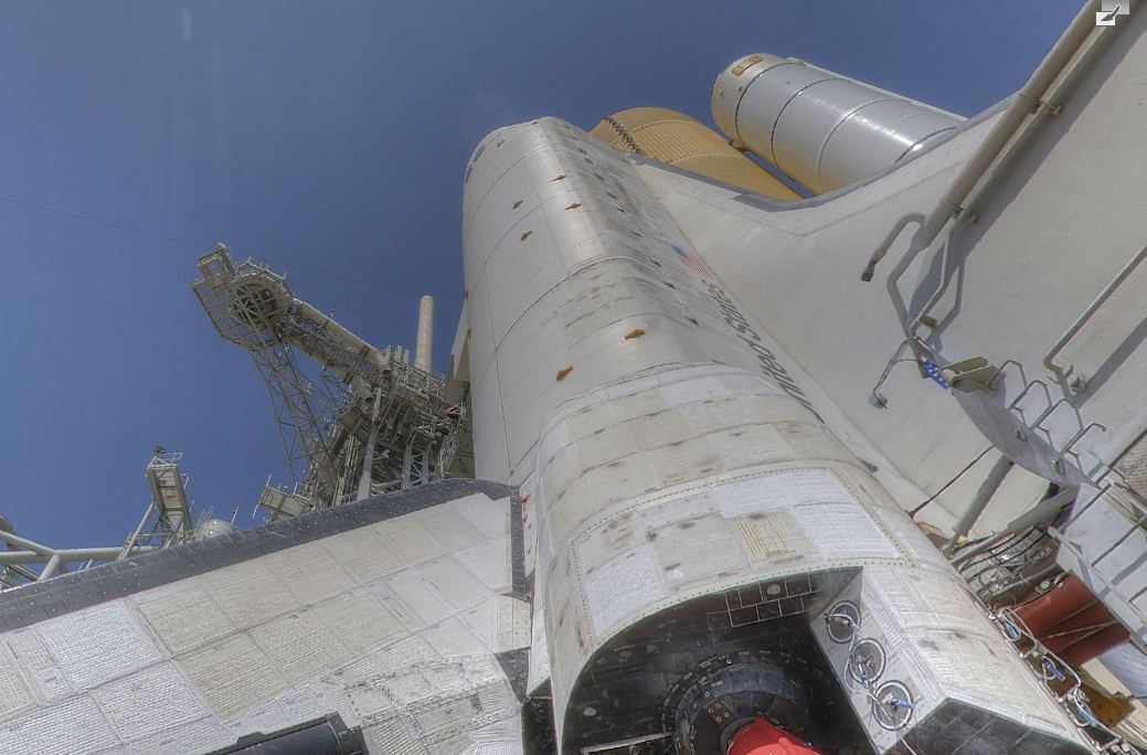 We've mentioned the NASATech website before, but this unique website and the incredible images by John O'Connor bear repeating. And for those of you wishing you were at the STS-133 launch today but can't be here, seeing John's high resolution, pan-able images is almost better -- you'll probably never get as close to the orbiters as these images can bring you. The image above is a screen clip of space shuttle Discovery on the launchpad, from the perspective of looking up at the orbiter from standing by the right OMS pod, and I was looking at another of John's images of Endeavour in the Orbiter Processing Facility where I was able to read the markings on each of the heat-resistant tiles on the orbiter's underside. John creates extremely high resolution virtual tours, and the interactive 360 degree images he creates are nothing short of stunning — but they are also very bandwidth intensive — so be prepared, and watch out if you don't have high speed internet or if you have a lot of browsers or windows open on your computer.