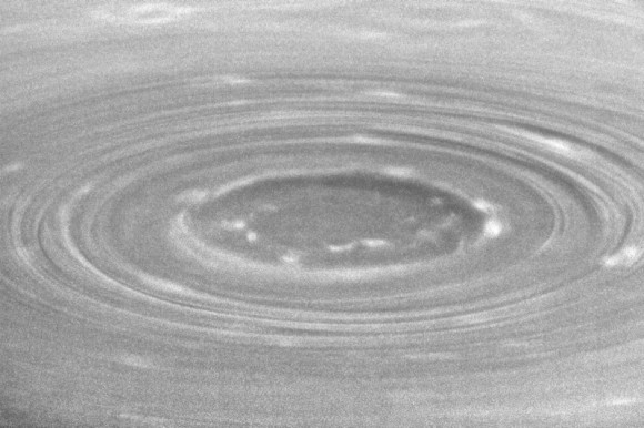 This grey-scale image of Saturn's northern polar vortex was captured by the Cassini spacecraft. This image was captured from a distance of about 1.2 million km. A portion of Saturn's rings are barely visible in the top right. Image: NASA/JPL-Caltech/Space Science Institute.[/caption]