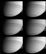 The series of eight images shown here was taken between Feb. 22 and Mar. 22, 2004; the image scale ranges from 381 kilometers (237 miles) to 300 kilometers (186 miles) per pixel. All images have been processed to enhance visibility. The top four frames, spanning 26 days, are portions of narrow angle camera images that were taken through a filter accepting light in the near-IR region of the spectrum centered at 619 nanometers, and show two spots approaching each other. Both storms are within half a degree of 36 degrees south latitude and sit in an anti-cyclonic shear zone, which means that the flow to the north is westward relative to the flow to the south. Consequently, the northern storm moves westward at a slightly greater rate than the southern one: 11 vs. 6 meters per second (25 and 13 miles per hour), respectively. The storms drift with these currents and engage in a counterclockwise dance before merging with each other.