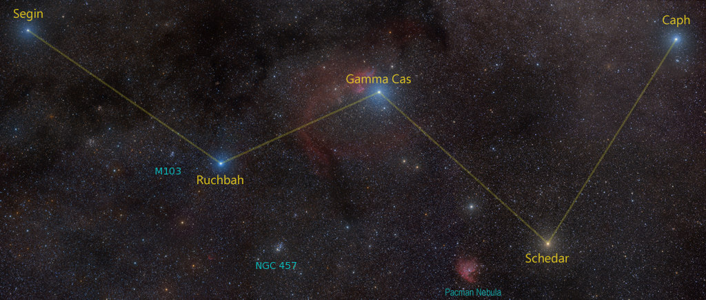 This zig-zag shaped circumpolar asterism consists of 5 primary stars (2 of which are the most luminous in the Milky Way Galaxy) and 53 Bayer/Flamsteed designated stars. It's brightest star - Beta Cassiopeiae, otherwise known by its traditional name Caph - is a yellow-white F-type giant with a mean