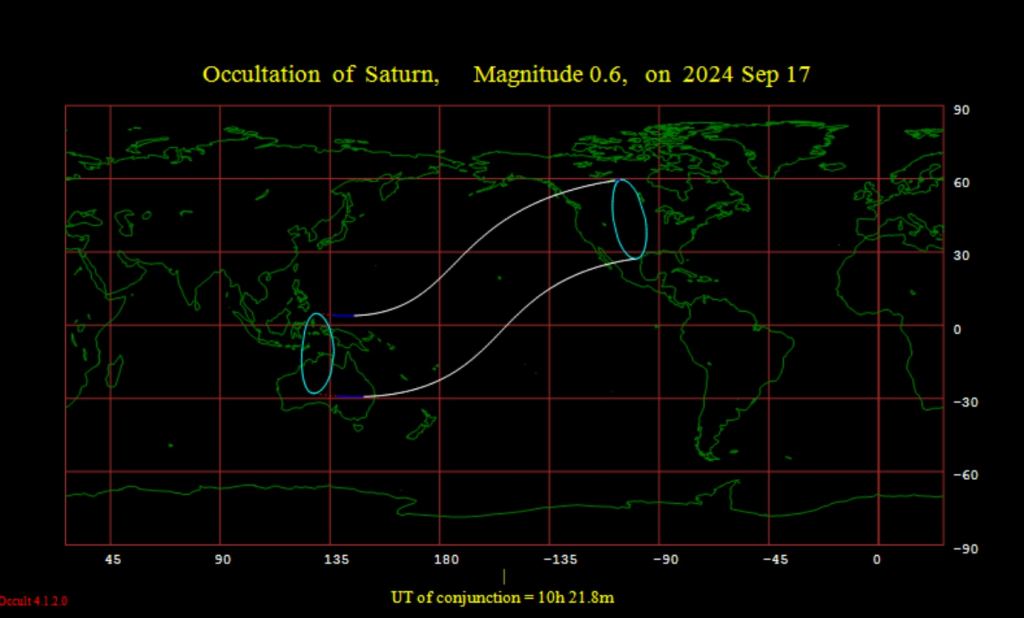 Just past mid-month on September 17th, the 99.2% illuminated, waxing gibbous Moon occults Saturn for western North America, centered on 10:22 UT in the early morning hours. Northeastern Australia and the nearby Pacific island region sees the event transpire in the evening. This is just nine days after Saturn will reach opposition for 2024 on the 8th. The occultation occurs 16 hours prior to Full Moon and the partial lunar eclipse on the 17th-18th. This eclipse favors the Americas, Africa and Europe. Saturn spans 19" during the event, and will take about 40 seconds to disappear and reappear from behind the Moon.