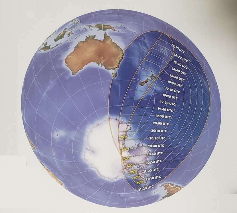 The entire eclipse lasts 4 hours, 24 minutes and 1 second in duration, from the first touchdown of the Moon’s outer shadow near the island of Fuji at 17:29 Universal Time (UT) until final departure near in Antarctic coast of the Weddell Sea at 21:53 UT. Remote Young Island between New Zealand and Antarctica will see the maximum obscuration for the Sun at 85%, though most populated areas will see less.