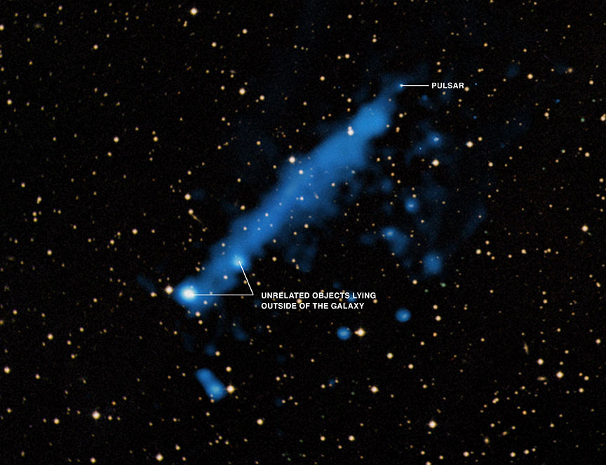 Viewable only at X-ray wavelengths, this incredible cosmic contrail is the longest ever associated with a so-called "rotation- powered" pulsar. Unlike other pulsars, J0357 gets its power from energy depletion as the spin rate decreases. But where did the plumage come from? According to the Chandra data, it may be an emission from energetic particles in the pulsar wind produced while turning around magnetic field lines. While artifacts of this type have been noted before, they're classed as bow-shocks generated by the supersonic motion of pulsars through space. From there, the wind pulls the particles along behind it as the pulsar passes through interstellar gas.