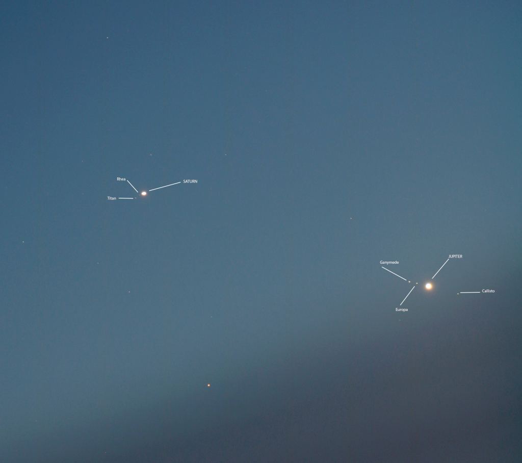 Be sure to crank up the magnification, as you'll have the rare opportunity to fit both solar system gas giants in the same field of view. You're looking at over 90% of the planetary mass of the entire Solar System, right in one convenient view. Jupiter is 33 arcseconds (") across on the night of the conjunction, while Saturn is 36" (with rings) from tip-to-tip. Be sure to check out the respective retinue of moons for each as they slide by one another in the sky.